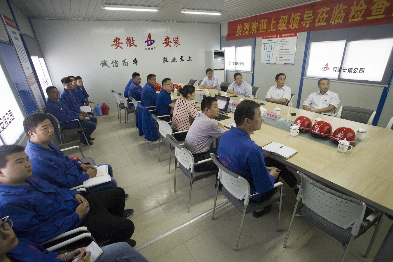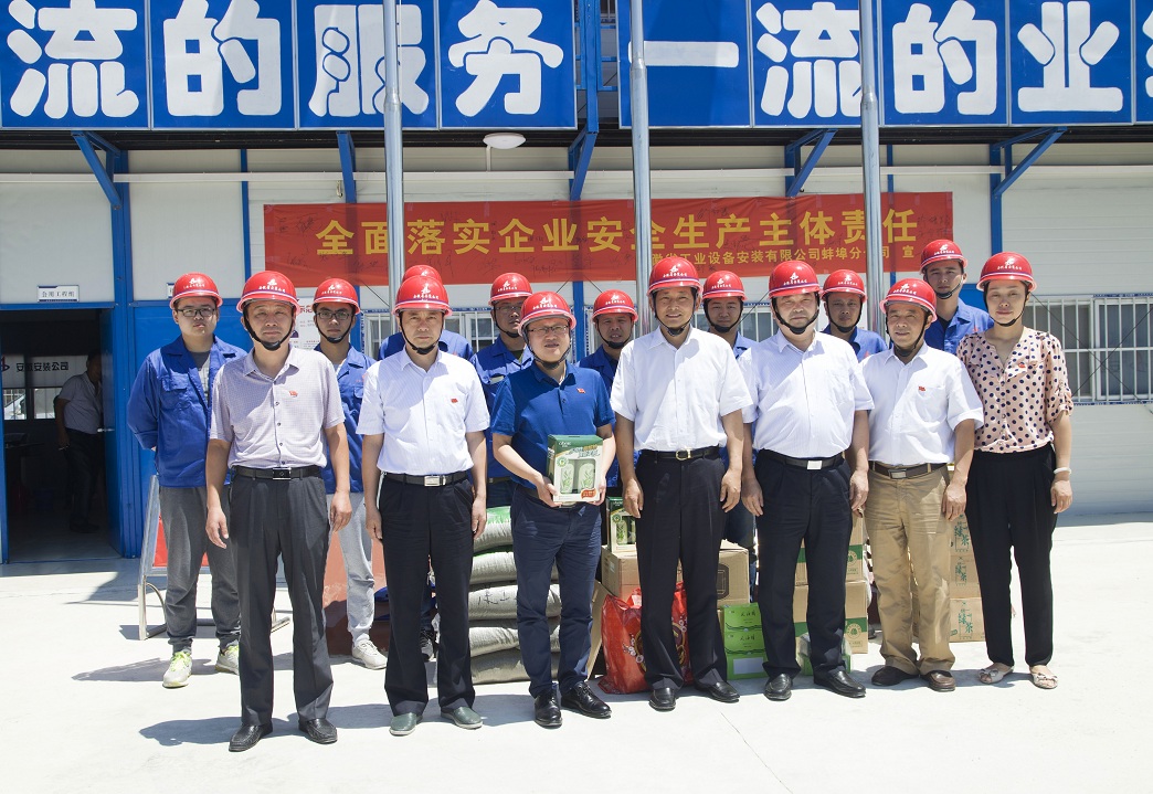 炎炎夏日送清涼,絲絲關愛寄深情。為確?;鶎右痪€職工安全度夏,7月21日上午,集團公司黨委副書記牛曙東冒著高溫酷暑,在黨委工作部主任徐文聯,安徽安裝公司董事長、總經理王軍邦,紀委書記、工會主席李寬旭的陪同下,到安徽安裝公司蚌埠卷煙廠項目,為堅守在高溫下工作一線的干部員工送去了“清涼”和集團黨委親切的慰問,同時還為黨員干部、入黨積極分子上了一堂別開生面的黨課。