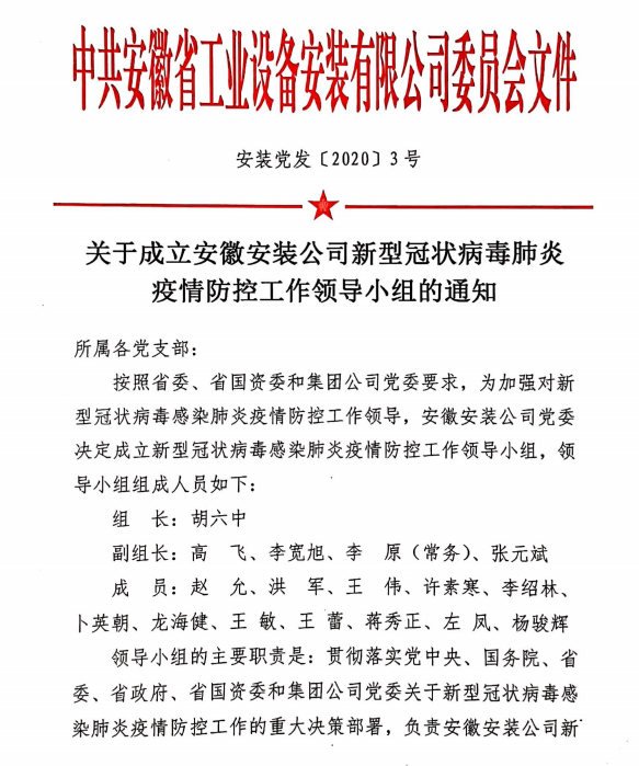一是組織到位。1月26日,安徽安裝公司下發(fā)《關(guān)于成立新型冠狀病毒感染肺炎疫情防控工作領(lǐng)導(dǎo)小組的通知》,負(fù)責(zé)貫徹落實(shí)上級(jí)關(guān)于新型冠狀病毒感染肺炎疫情防控工作的重大決策部署,負(fù)責(zé)安徽安裝公司新型冠狀病毒感染肺炎疫情防控工作的領(lǐng)導(dǎo),研究解決安徽安裝公司疫情防控中的重大問題,統(tǒng)籌組織防控處置。
