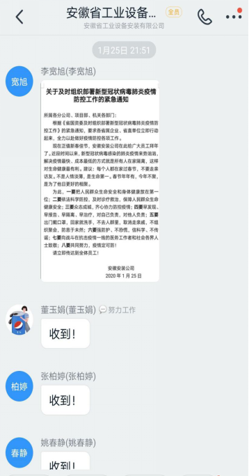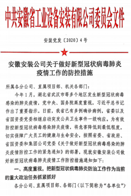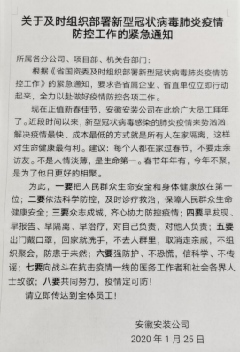 二是部署到位。疫情防控工作開展后,1月25日(大年初一)安徽安裝公司發(fā)出防控疫情工作的緊急通知,1月27日制定肺炎疫情防控措施,對(duì)疫情防控工作進(jìn)行細(xì)化安排,周密部署。要求各分公司、直屬項(xiàng)目部、各部門要以對(duì)職工群眾生命安全高度負(fù)責(zé)的態(tài)度,精準(zhǔn)施策,堅(jiān)決遏制疫情在安徽安裝公司輸入、蔓延,鼓勵(lì)職工戴口罩、勤洗手、多通風(fēng)、少走動(dòng)、常消毒。
