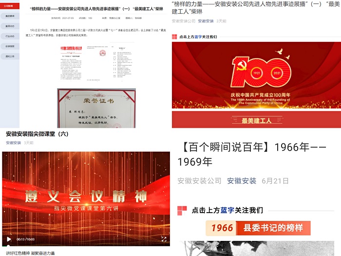 公司黨委第一時(shí)間編印專刊宣傳板報(bào)下發(fā)至所屬各單位和基層項(xiàng)目一線,用好企業(yè)網(wǎng)站、微信公眾號、電子屏、宣傳欄和所屬各單位、各項(xiàng)目部所有宣傳陣地,在公司網(wǎng)站、微信公眾號先后開設(shè)“百個(gè)瞬間說百年”“黨史學(xué)習(xí)教育專欄系列報(bào)道”“榜樣的力量——安徽安裝公司先進(jìn)人物先進(jìn)事跡展播”“記錄奮進(jìn)力量—安徽安裝公司基層一線事跡展播”等專欄進(jìn)行專題宣傳,大力營造“學(xué)習(xí)黨史有熱情,干事創(chuàng)業(yè)有激情”的良好氛圍,合肥分公司黨支部舉辦黨史學(xué)習(xí)教育主題攝影大賽,努力營造悟初心、守初心、踐初心的強(qiáng)大聲勢。