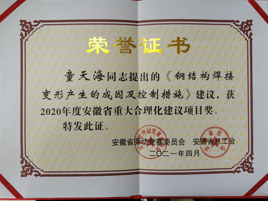 近日,由安徽省勞動(dòng)競(jìng)賽委員會(huì)和安徽省總工會(huì)聯(lián)合評(píng)選的“2020年度安徽省重大合理化建議項(xiàng)目獎(jiǎng)”揭曉,安徽安裝公司童提出的《鋼結(jié)構(gòu)焊接變形產(chǎn)生的成因及控制措施》成功入選。