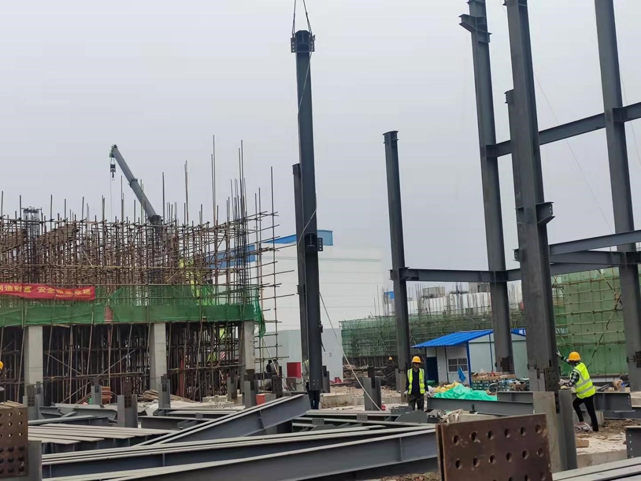 發酵車間C區鋼結構區域,吊裝作業正在如火如荼進行;B區滿堂腳手架緊張搭設,鋼筋工頂著烈日進行鋼筋綁扎,投料車間兩臺挖機聯動,進行管廊支架基礎基坑開挖,控制車間正在忙忙碌碌進行內墻二次結構砌筑。各個車間有條不紊的忙碌著,整個項目現場一片火熱,迅速掀起“比、學、趕、幫、超”施工高潮!