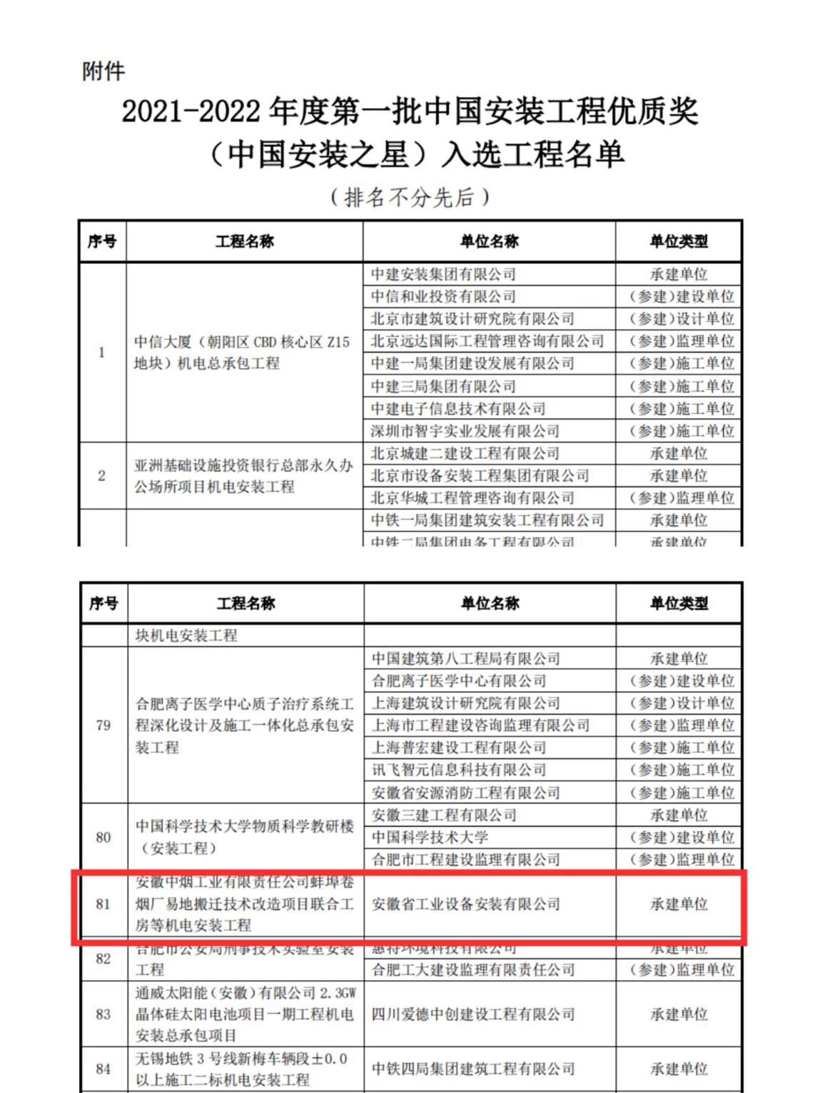 2021年公司首次一年內獲得兩項國家級優質工程獎,即中國鋼結構金獎、中國安裝工程優質獎(安裝之星)。